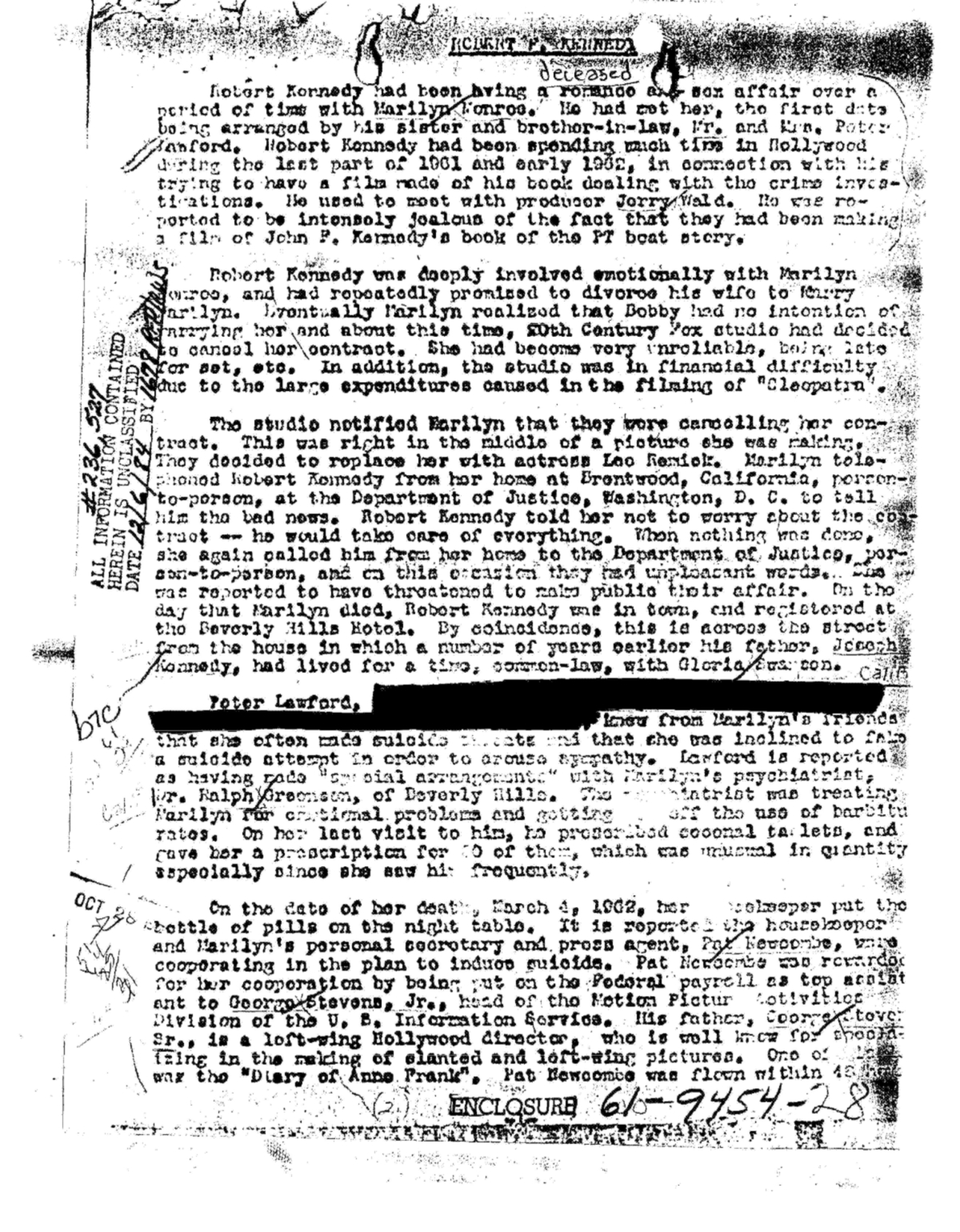 On the date of her death, March 4, 1962, her housekeeper put the bottle of pills on the night table. It is reported the housekeeper and Marilyn’s personal secretary and press agent, Pat Newcombe, were cooperating in the plan to induce suicide. Pat Newcombe was rewarded for her cooperation by being put on the Federal payroll as top assistant to George Stevens, Jr., head of the Motion Picture Activities Division of the U.S. Information Services. His father, George Stevens, Sr., is a left-wing Hollywood director, who is well known for specializing in the making of slanted and left-wing pictures. One of [the pictures] was the “Diary of Anne Frank”. Pat Newcombe was flown within 48 hours after Marilyn’s death from Los Angeles International Airport directly to Hyannisport, Massachusetts. The helicopter was sent to [words obscured by clips] where she [resided] for over a year with [money] reportedly supplied by Robert Kennedy. [Pat and] Peter Lawford, who [words obscured] flew to Hyannisport just before Pat Newcombe. On the day of Marilyn’s death, Robert Kennedy checked out of the Beverly Hills Hotel and flew from Los Angeles International Airport via Western Airlines to San Francisco, where he checked into the St. Francis Hotel. The owner of this hotel is a Mr. [illegible] London, a friend of Robert Kennedy. Robert Kennedy made a telephone call from St. Charles Hotel, San Francisco, to Peter Lawford to find out if Marilyn was dead yet. Peter Lawford had called Marilyn’s number and [talked] with her, and then checked again later to make sure she did not [illegible]. Marilyn’s housekeeper, after she had taken the seconal tablets, called psychiatrist for Marilyn and said she had taken the bottle of pills. Marilyn expected to have her stomache pumped out and to get sympathy through her suicide attempt. The psychiatrist left word for Marilyn to take a drive in the fresh air, but he did not come to see her until after she was known to be dead. Marilyn received a call from Joe DiMaggio, Jr., who was in the U.S. Marines, stationed at Camp Pendleton, California. They were very friendly. Marilyn told him she was getting very sleepy. The last call she attempted to make was to Peter Lawford to return a call he had made to her. Joe DiMaggio, Sr., knows the whole story and is reported to have stated when Robert Kennedy gets out of office, he intends to kill him. [Redacted] knew of the affair between Robert Kennedy and Marilyn.