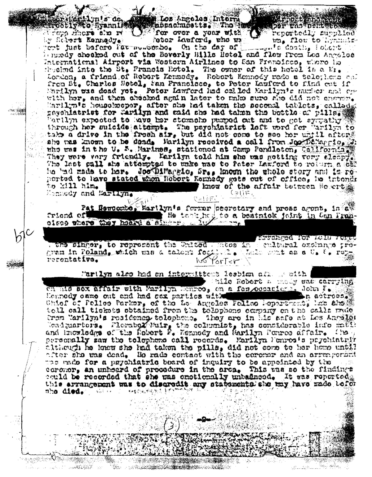 Marilyn also had an intermittent lesbian affair with [redacted]. While Robert Kennedy was carrying on his affair with Marilyn Monroe, on a few occasions, John F. Kennedy came out and had sex parties with [the deceased] actress. Chief of Police Parker, of the Los Angeles Police Department, [possesses the] toll call tickets obtained from the telephone company on the calls made from Marilyn’s residence telephone. They are in his safe at Los Angeles Headquarters. Florabel Muir, the columnist, has considerable information and knowledge of the Robert F. Kennedy and Marilyn Monroe affair. She personally saw the telephone call records. Marilyn’s psychiatrist, although he knew she had taken the pills, did not come to her home until after she was dead. He made contact with the coroner and an arrangement was made for a psychiatric board of inquiry to be appointed by the coroner, an unheard of procedure in the area. This was so the findings could be recorded that she was emotionally unbalanced. It was reported this arrangement was to discredit any statements she may have made before she died.
